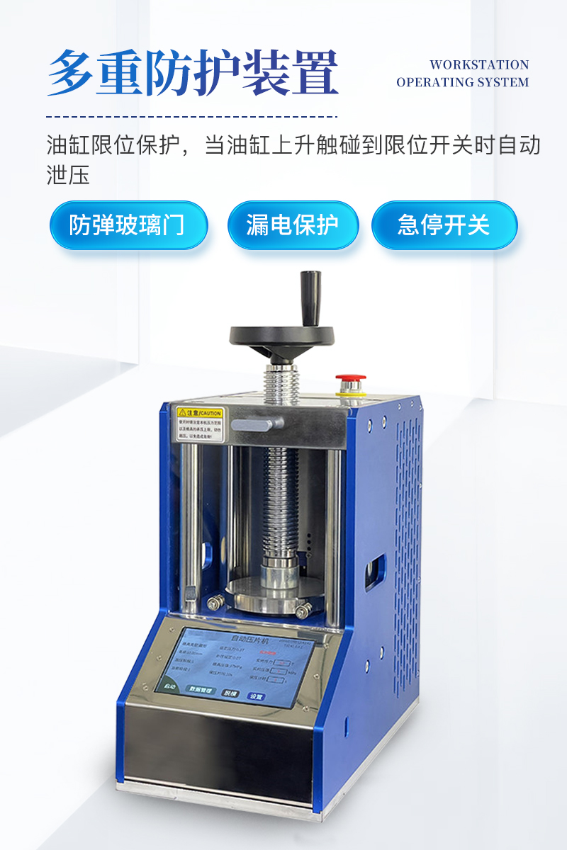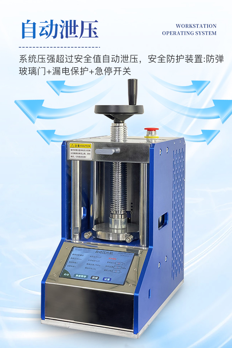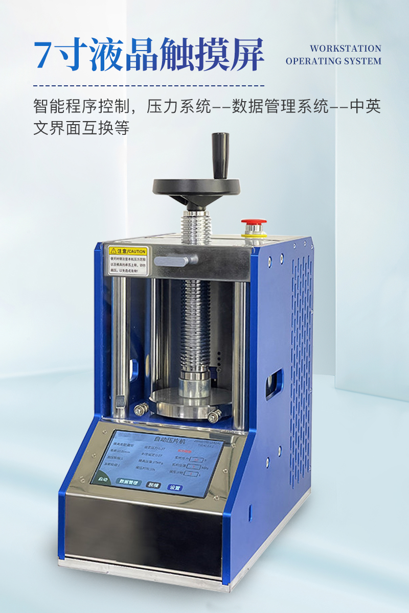自动粉末压片机该机配置7寸触摸液晶屏,程序控制实现了精准控压,满足了客户多段加压的需求,另外还增设了很多安全配置,适合**实验室使用。